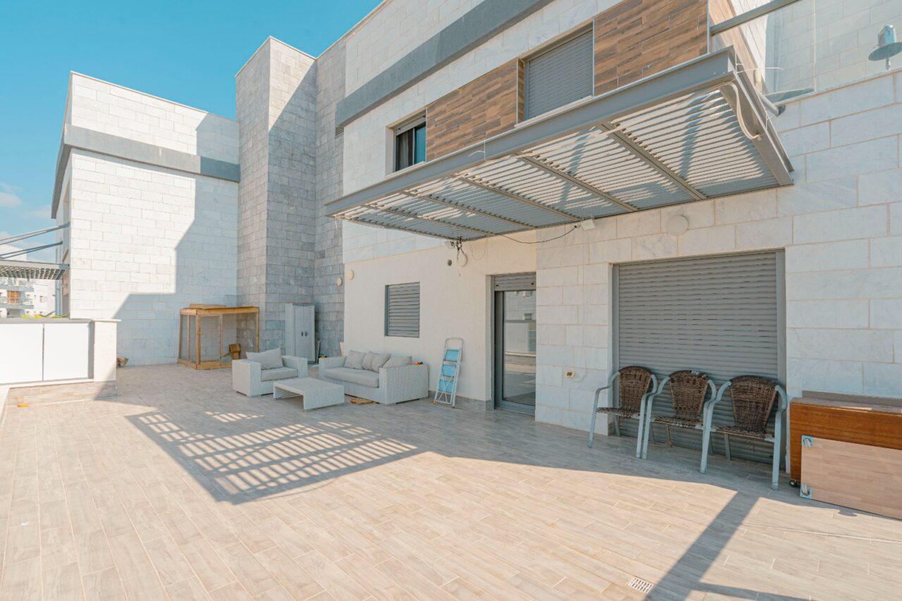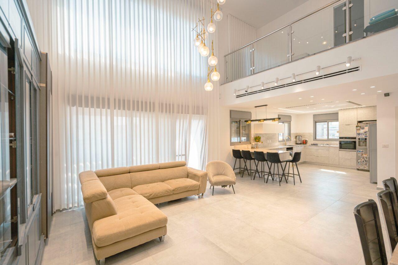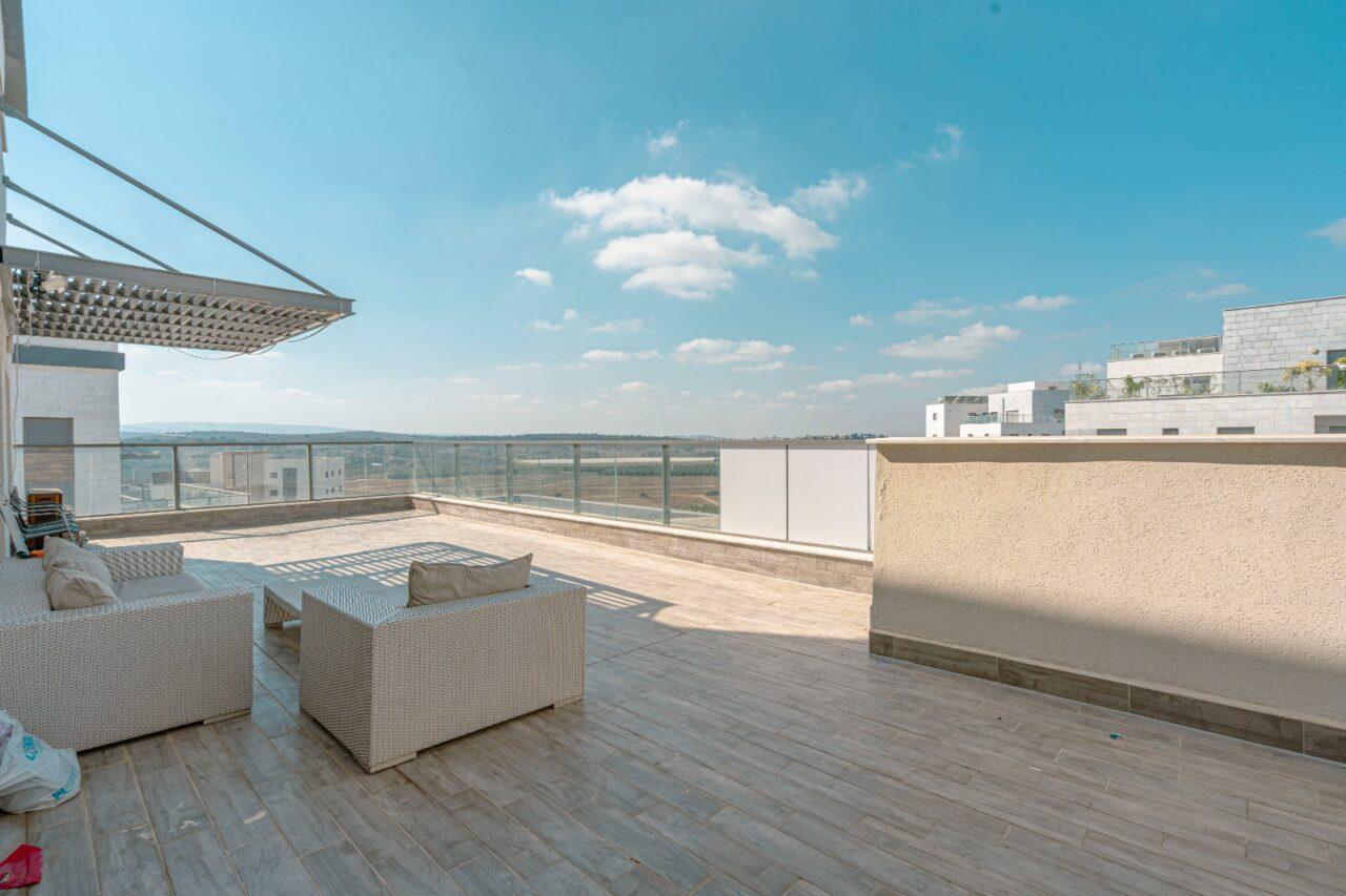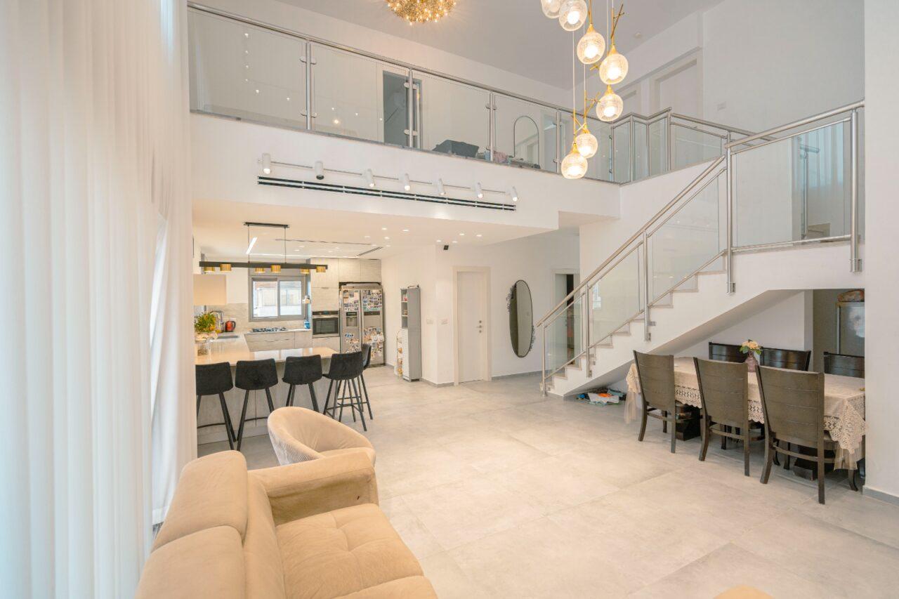 6 חדרים, כ 200 מ”ר, 3 מרפסות, 2 מרפסות בקומה תחתונה, אחת בגודל 90 מ”ר, מרפסת שניה בגודל 65 מ”ר.